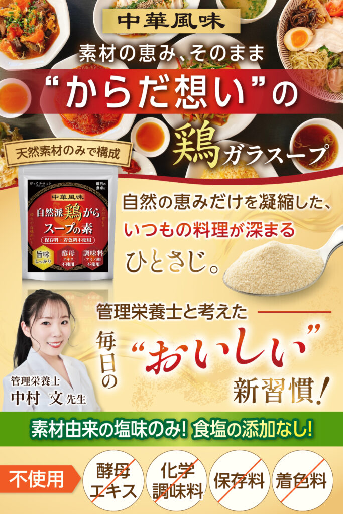 自然派鶏がらスープの素、無添加ドライフルーツ、無添加ビタミンD+Eサプリメント…多数商品を開発販売中です